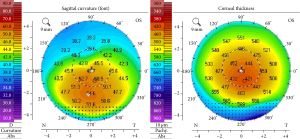 • شدة الانحدار من أكبر انحناء من 'معتدل' (<45 D)، 'تقدم' (تصل إلى 52 D) أو "شديد" (> 52 D)؛