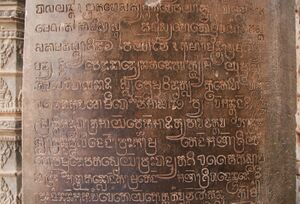 The Khmer script was adapted from the Pallava script, used in southern India and Southeast Asia during the 5th and 6th centuries AD,[3] which ultimately descended from the Tamil-Brahmi script.[4] The oldest dated Khmer inscription was found at Angkor Borei District in Takéo Province south of Phnom Penh and dates from 611.[5] Stelae of the Pre-Angkorean and Angkorean periods, featuring the Khmer script, have been found throughout the former Khmer Empire, from the Mekong Delta to what is now southern Laos, Northeast Thailand, and Central Thailand.[6] Slight differences can be seen between ancient Khmer inscriptions written in Sanskrit and those written in Khmer. These two different systems have evolved into the modern âksâr mul and âksâr chriĕng styles of Khmer script. The former is used for sacred inscriptions while the latter is used for general use.[7] The âksâr chriĕng style is a cursive form of âksâr mul, adapted to fit the Khmer language.[8]