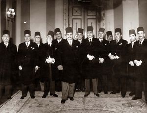 The day before Farouk was tentatively due to be deposed, Prince Hassanein arrived at the British Embassy with a letter for Lampson saying: "I am commanded by His Majesty to inform Your Excellency that he has decided to leave the present Government in Office for the time being".[68] As Nahas became unpopular, he sought to embrace Arab nationalism to rally support, having Egypt join the Arab League in October 1944 and speaking more and more about "the Palestine question".[69] In October 1944, when Lampson went away for a vacation in South Africa, Farouk finally dismissed Nahas as prime minister on 8 October 1944, and replaced him with Ahmed Maher, the brother of Ali Maher.[70] The dismissal of Nahas was seen by Lampson as a personal defeat, who complained in his diary that he would never have a politician "in our pocket" like him again, and was seen as a decisive turning point when Farouk had finally outwitted Lampson.[71] But at the same time, Lampson admitted that Nahas by his corruption had become a liability, and that Britain could not continue to support a corrupt government in the long run, as the British people would not tolerate going to war with Egypt to keep someone like Nahas in office.[72]