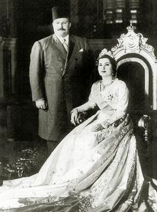In the meantime, Farouk spent his nights at the Auberge des Pyramides nightclub with Cohen or his latest mistress, the French singer Annie Berrier.[115] At the same time, Farouk was engaged in a relationship with the American model Patricia "Honeychilde" Wilder, who stated in an interview that of all her lovers, he was the one who had the best sense of humour and made her laugh the most.[116] In September 1949, when Jefferson Caffery arrived in Cairo as the new U.S. ambassador and met Farouk for the first time, the king told Caffery (who came from Louisiana) that just as the South had its blacks good only for picking cotton, so too did Egypt have its fellaheen likewise only good for picking cotton.[117] Karim Thabet of the "kitchen cabinet", a man whom Caffery called a "jackal", convinced Farouk that the best way of renewing his popularity was to marry again, saying the Egyptian people loved royal weddings and to marry a commoner again would show his populist side.[118] Caffery reported that the king had listed his requirements for his new bride that she be of the grande bourgeoise class, be at least 16 years old, be an only child, and be of Egyptian descent only.[118] Thabet selected Narriman Sadek to be the new bride of the king, notwithstanding she was already engaged to Zaki Hashem, a PhD candidate in economics at Harvard University who was working in New York as a United Nations economist.[119] After Farouk had made Sadek's father a bey, he broke off her engagement to Hashem who complained to the American press that the king had stolen his fiancée and broken his heart.[120] After Farouk announced his engagement to Sadek, he sent her off to Rome to be taught how to be a proper cultured lady to make her fit to be a queen.[121] In January 1950, in a volte-face that stunned observers of Egyptian politics, Thabet arranged an alliance between the king and Nahas Pasha.[122] Caffery reported to Washington: