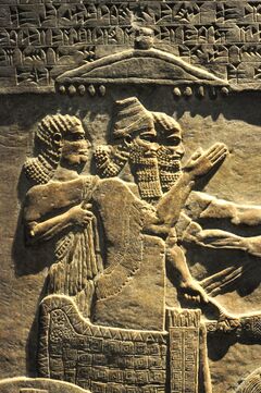 In contrast to the titles employed by the Babylonian kings in the south, which typically focused on the protective role and the piety of the king, Assyrian royal inscriptions tend to glorify the strength and power of the king.[14] Assyrian titularies usually also often emphasize the royal genaeology of the king, something Babylonian titularies do not, and also drive home the king's moral and physical qualities while downplaying his role in the judicial system.[15] Assyrian epithets about royal lineage vary in how far they stretch back, most often simply discussing lineage in terms of "son of ..." or "brother of ...". Some cases display lineage stretching back much further, Shamash-shum-ukin (ح667–648 BC) describes himself as a "descendant of Sargon II", his great-grandfather. More extremely, Esarhaddon (ح681–669 BC) calls himself a "descendant of the eternal seed of Bel-bani", a king who lived more than a thousand years before him.[16]