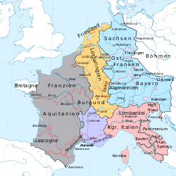 ![]() Division of the Carolingian Empire after the Treaty of Prüm in 855, with Italian realm colored in pink |