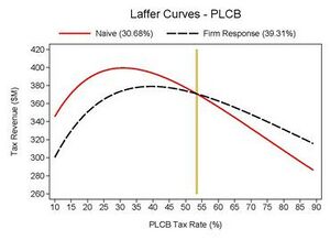 The Laffer curve has also been extended to taxation of goods and services. In their 2018 Econometrica paper, Miravete, Seim, and Thurk, show that in non-competitive markets, the strategic pricing response of firms is important to consider when estimating the Laffer curve.[31] The authors show that firms increase their prices in response to a decrease in the ad valorem tax, leading to less of a quantity increase than would otherwise be expected. The net effect is to flatten the Laffer curve and move the revenue maximum point to the right.