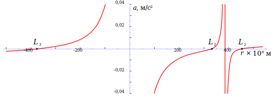 where r is the distance from the large body M1, R is the distance between the two main objects and sgn(x) is the sign function of x. The terms in this function represent respectively: force from M1; force from M2; and centripetal force. The points L3, L1, L2 occur where the acceleration is zero — see chart at right. Positive acceleration is acceleration towards the right of the chart and negative acceleration is towards the left; that is why acceleration has opposite signs on opposite sides of the gravity wells.