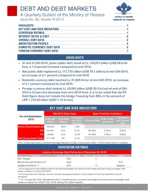 وحسب وزارة المالية اللبنانية، ففي الربع الثالث من 2019 بلغ الدين العام 86.8 بليون دولار، بزيادة 1.9% عن العام السابق 2018. أما الدين بالعملة الأجنبية فقد بلغ في الفترة نفسها 32 بليون دولار بزيادة 3% عن عام 2018.