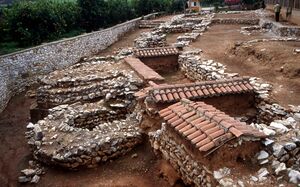 The site of Lerna is one of the largest prehistoric tumuli in Greece (ca. 180 m by 160 m across), which accumulated during a long Neolithic occupation. The crest of the mound was levelled and extended in the Early Bronze Age (Early Helladic II period, ca. 2500–2200 BC), as at Eutresis and Orchomenus,[7] for the construction of a new settlement, known as Lerna III in the site's stratigraphy. Lerna III lacks signs of continuity with the previous occupation. It was strongly fortified by a double ring of defensive walls with towers[8] and was the site of a two-storey palace or administrative center known as House of the Tiles, for the terracotta tiles that sheathed its roof (an early example of tile roofing).[9] This building was destroyed by fire at the end of the Early Helladic II period.[10] In the following period (Lerna IV = Early Helladic III) the site of the "House of the Tiles" was covered by an earthen tumulus and not built upon again, whether through respect[11] or fear, until, at the end of the Middle Helladic period, shaft graves were cut into the tumulus, suggesting that the significance of the monument had been forgotten. Lerna was used as a cemetery during the Mycenaean age (Late Helladic period), but was abandoned about 1250 BCE.