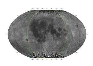 Theoretical extent of visible lunar surface (in green) due to libration, compared to the extent of the visible lunar surface without libration (in yellow). The projection is the Winkel Tripel projection.