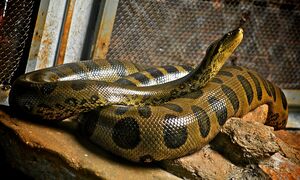 • The most massive living member of this highly diverse reptilian order is the green anaconda (Eunectes murinus) of the neotropical riverways. These may exceed 6 m (20 ft) and 200 kg (440 lb), although such reports are not fully verified.[53] Rumors of larger anacondas also persist.[54] The reticulated python (Malayopython reticulatus) of Southeast Asia is longer but more slender, and has been reported to measure as much as 8 m (26 ft) in length and weigh up to 168 kg (370 lb).[1][55][56] The Burmese python, a south-east Asian species is known to reach up to 6 m (20 ft) and weigh as much as 150 kg (330 lb) and is generally among the three heaviest species of snakes.[57] Several other species of python can reach or exceed 6 m (20 ft) in length and 90 kg (200 lb) in weight. The fossil of the largest snake ever, the extinct boa Titanoboa were found in coal mines in Colombia. This snake was estimated to reach a length of 12.8 m (42 ft) and weighed about 1،135 kg (2،502 lb).[58]