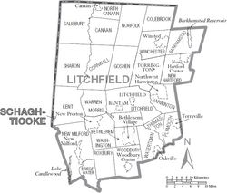 Map of Litchfield County, Connecticut showing cities, boroughs, towns, CDPs, and Indian Reservations