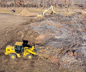 A Caterpillar 930G fitted with a loader rake on a residential construction site in South Florida.