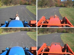 Unlike backhoes or standard tractors fitted with a front bucket, many large loaders do not use automotive steering mechanisms. Instead, they steer by a hydraulically actuated pivot point set exactly between the front and rear axles. This is referred to as "articulated steering" and allows the front axle to be solid, allowing it to carry greater weight. Articulated steering provides better maneuverability for a given wheelbase. Since the front wheels and attachment rotate on the same axis, the operator is able to "steer" his load in an arc after positioning the machine, which can be useful. The tradeoff is that when the machine is "twisted" to one side and a heavy load is lifted high, it has a greater risk of turning over to the "wide" side.