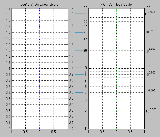 When values that span large ranges need to be plotted, a logarithmic scale can provide a means of viewing the data that allows the values to be determined from the graph. The logarithmic scale is marked off in distances proportional to the logarithms of the values being represented. For example, in the figure below, for both plots, y has the values of: 1, 2, 3, 4, 5, 6, 7, 8, 9 10, 20, 30, 40, 50, 60, 70, 80, 90 and 100. For the plot on the left, the log10 of the values of y are plotted on a linear scale. Thus the first value is log10(1) = 0; the second value is log10(2) = 0.301; the 3rd value is log10(3) = 0.4771; the 4th value is log10(4) = 0.602, and so on. The plot on the right uses logarithmic (or log, as it is also referred to) scaling on the vertical axis. Note that values where the exponent term is close to an integral fraction of 10 (0.1, 0.2, 0.3, etc.) are shown as 10 raised to the power that yields the original value of y. These are shown for y = 2, 4, 8, 10, 20, 40, 80 and 100.