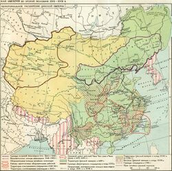 وفي القرن التاسع عشر، وتحت تأثير القوى الاستعمارية الغربية أخذت بريطانيا التبت وفرنسا هيتان Hetan وألمانيا شانتون Chanton، واحتلت روسيا تركستان ومنغوليا وضَمت منشوريا الخارجية إليها، كما وقعت منشوريا الداخلية تحت التأثير الروسي. وفي عام 1860م، وقَّعَت كل من روسيا والصين اتفاقية أصبحت بمقتضاها المقاطعة الواقعة شمال نهر أَمُور وشرق نهر أوسوري تابعةً لروسيا. وقد سمحت الصين لروسيا بإنشاء خط حديدي شرق الصين عبر منشوريا وحتى ميناء فلاديفوستوك الروسي. وبعد عامين استأجرت روسيا أراضي في شبه صحراء ليادونگ، وأقامت فيها قاعدة بحرية في لوشون (ميناء آرثر) وميناء آخر في لُودا.