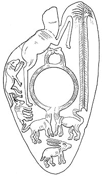 يتكون ثلث اللوحة التجميلية الاحتفالية من دائرة خلط لمستحضرات تجميل العيون، وتتكون الدائرة من رقبتي الأسدين المتواجهين. هناك لوحتان أخريان على شكل نمر-ثعبان، الذي يظهر في لوحة نارمر ولوحة أكسفورد (لوحة هيراكونپوليس الصغرى)، ويُعتقد أنهما يشيران إلى التوحيد الأولي لـ الوجه العلوي و مصر السفلى. قد توضح المزيد من القطع الأثرية من عهد فرعون دن هذه الفترة الزمنية من الأسرة الأولى.