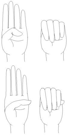 علامة معصم إيجابية لشخص مصاب بمتلازمة مارفان(يبدو الابهام والاصبع الصغير متداخل عند إمساك المعصم باليد الأخرى.).[1] | |