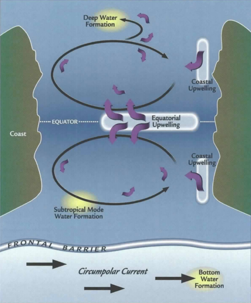 Thermohaline circulation drives a global-scale system of currents called the “global conveyor belt.” The conveyor belt begins on the surface of the ocean near the pole in the North Atlantic. Here, the water is chilled by Arctic temperatures. It also gets saltier because when sea ice forms, the salt does not freeze and is left behind in the surrounding water. The cold water is now more dense, due to the added salts, and sinks toward the ocean bottom. Surface water moves in to replace the sinking water, thus creating a current. This deep water moves south, between the continents, past the equator, and down to the ends of Africa and South America. The current travels around the edge of Antarctica, where the water cools and sinks again, as it does in the North Atlantic. Thus, the conveyor belt gets "recharged." As it moves around Antarctica, two sections split off the conveyor and turn northward. One section moves into the Indian Ocean, the other into the Pacific Ocean. These two sections that split off warm up and become less dense as they travel northward toward the equator, so that they rise to the surface (upwelling). They then loop back southward and westward to the South Atlantic, eventually returning to the North Atlantic, where the cycle begins again. The conveyor belt moves at much slower speeds (a few centimeters per second) than wind-driven or tidal currents (tens to hundreds of centimeters per second). It is estimated that any given cubic meter of water takes about 1,000 years to complete the journey along the global conveyor belt. In addition, the conveyor moves an immense volume of water—more than 100 times the flow of the Amazon River (Ross, 1995). The conveyor belt is also a vital component of the global ocean nutrient and carbon dioxide cycles. Warm surface waters are depleted of nutrients and carbon dioxide, but they are enriched again as they travel through the conveyor belt as deep or bottom layers. The base of the world's food chain depends on the cool, nutrient-rich waters that support the growth of algae and seaweed.[31]