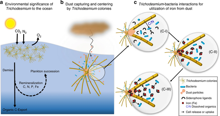 - ^ Basu, Subhajit; Gledhill, Martha; De Beer, Dirk; Prabhu Matondkar, S. G.; Shaked, Yeala (2019). "Colonies of marine cyanobacteria Trichodesmium interact with associated bacteria to acquire iron from dust". Communications Biology. 2: 284. doi:10.1038/s42003-019-0534-z. PMC 6677733. PMID 31396564.