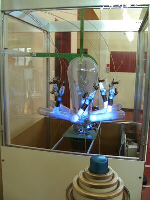 Mercury arc valves were used extensively in DC power systems on London Underground,[14] and two were still observed to be in operation in 2000 at the disused deep-level air-raid shelter at Belsize Park.[15] After they were no longer needed as shelters, Belsize Park and several other deep shelters were used as secure storage, particularly for music and television archives. This led to the mercury-arc rectifier at the Goodge Street shelter featuring in an early episode of Doctor Who as an alien brain, cast for its "eerie glow".[16]