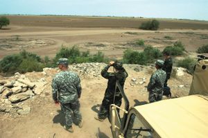 أحد أفراد الحرس الوطني العسكري الأمريكي يعمل برفقة الدورية الحدودية الأمريكية لدعم Operation Jump Start، أريزونا، يوليو 2006.