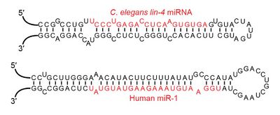 The first miRNA was discovered in 1993 by a group led by Victor Ambros and including Lee and Feinbaum. However, additional insight into its mode of action required simultaneously published work by Gary Ruvkun's team, including Wightman and Ha.[16][34] These groups published back-to-back papers on the lin-4 gene, which was known to control the timing of C. elegans larval development by repressing the lin-14 gene. When Lee et al. isolated the lin-4 miRNA, they found that instead of producing an mRNA encoding a protein, it produced short non-coding RNAs, one of which was a ~22-nucleotide RNA that contained sequences partially complementary to multiple sequences in the 3' UTR of the lin-14 mRNA.[16] This complementarity was proposed to inhibit the translation of the lin-14 mRNA into the LIN-14 protein. At the time, the lin-4 small RNA was thought to be a nematode idiosyncrasy.