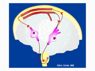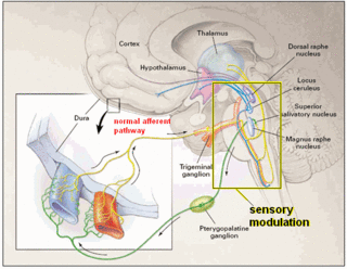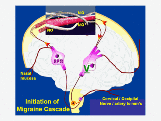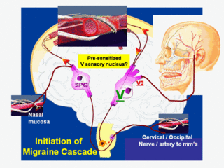As the swelling enlargement of the intracranial surface arteries stimulates sensory fibers of V1 (ophthalmic branch of the tri- geminal, V), "noxious" (meaning potentially harmful) information is relayed to (afferent) the sensory nucleus of the trigeminal. Then, either as a result of genetic properties of the host (as in a pre-existing elevated sympathetic tone), or as a result of a pre-sensitization of the sensory nucleus (addressed further below), or both, Calcitonin Gene-Related Peptide (CGRP) is secreted by the nerve endings of V1 (as are other noxious chem- icals), thereby producing a frank inflammation of the arteries, which is thought to be primarily responsible for the patient's pain, throbbing and aversion to movement.