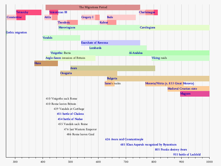 Battle of LechfeldFranksAsparuhConstantinopleBattle of NedaoBattle of ChalonsMagyarsMedieval Croatian stateGreat MoraviaSamoBulgariaOnoguriaEurasian AvarsHunsVikingAnglo-SaxonAl-AndalusVisigothVandalsGothsLombardsExarchate of RavennaCarolingiansMerovingianKubratTheodoric the GreatBedeGregory IAttilaConstantine the GreatCharlemagneValentinian IIITetrarchy