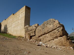 مثال على المقطع المرمم (على اليسار) مقابل القسم غير المرمم (على اليمين) من الجدار تراب مدكوك في فاس البالي