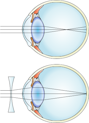 Tentative evidence indicates that the risk of near-sightedness can be decreased by having young children spend more time outside.[6][7] This may be related to natural light exposure.[8] Near-sightedness can be corrected with eyeglasses, contact lenses, or a refractive surgery.[1] Eyeglasses are the easiest and safest method of correction.[1] Contact lenses can provide a wider field of vision, but are associated with a risk of infection.[1] Refractive surgery permanently changes the shape of the cornea.[1]