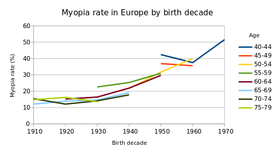 - ^ Williams KM, Bertelsen G, Cumberland P, Wolfram C, Verhoeven VJ, Anastasopoulos E, et al. (July 2015). "Increasing Prevalence of Myopia in Europe and the Impact of Education". Ophthalmology. 122 (7): 1489–97. doi:10.1016/j.ophtha.2015.03.018. PMC 4504030. PMID 25983215.
