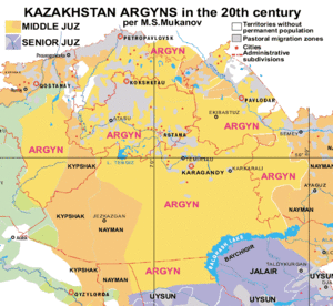 Ethnographic map of the Middle or Orta zhuz in Kazakhstan in the early 20th century, following M. S. Mukanov (1991).[18]
