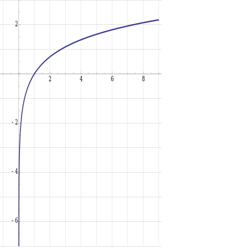 Graph of the natural logarithm function. The function slowly grows to positive infinity as x increases and rapidly goes to negative infinity as x approaches 0 ("slowly" and "rapidly" as compared to any power law of x); the y-axis is an asymptote.