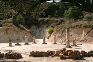 At the temenos, the grave of Opheltes was surrounded by open-air altars and enclosed within a stone wall.[1] The sanctuary's necessary spring was named Adrasteia: Pausanias wondered whether it had the name because an "Adrastos" had "discovered" it,[1] but Adrasteia, the "inescapable one", was a nurse of the infant Zeus in Crete. The tumulus nearby was credited as the burial mound of his father, and the men of Argos had the privilege of naming the priest of Nemean Zeus, Pausanias was informed when he visited in the late 2nd century CE. In his time the temple, which he noted was "worth seeing", stood in a grove of cypresses; its roof had fallen in and there was no cult image within the temple. Three limestone columns of the Temple of Nemean Zeus of about 330 BC have stood since their construction, and two more were reconstructed in 2002.[3] As of late 2007, four more are being re-erected.[4] Three orders of architecture were employed at this temple, which stands at the end of the Classic period and presages this and other developments of Hellenistic architecture, such as the slenderness (a height of 6.34 column diameters) of the Doric columns of the exterior.[5] The site around the temple has been excavated in annual campaigns since 1973: the great open-air altar, baths, and ancient accommodations for visitors have been unearthed. The temple stands on the site of an Archaic period temple, of which only a foundation wall is still visible. The stadion has recently been discovered. It is notable for its well-preserved vaulted entrance tunnel, dated to about 320 BC, with ancient graffiti on the walls.