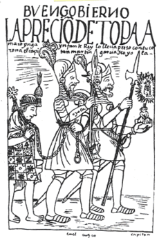 The Inca military was swift in adopting European weaponry; many warriors captured helmets, shields, and swords during the initial clashes with the Europeans and quickly learned how to utilize them. In marked contrast to some other Native American cultures, such as the Aztecs, the Incas were also eager to master weaponry which was wholly "alien" to them.[6] As early as 1537, when Manco Inca defeated the Spanish at Pilcosuni, they came into possession of more advanced Spanish weapons, including arquebuses, artillery, and crossbows.[7] By the later stages of the Siege of Cusco, the Spaniards were already reporting that the Inca warriors were using captured firearms as well as horses with some proficiency. Manco Inca even forced captured Europeans to refine gunpowder for his army.[6] The Incas also tried to adopt some European battle tactics: On at least one occasion, a group of Inca warriors formed a tight unit in combat, based on the teachings of a captured Spaniard, and used their bows, slings, and darts in a way to achieve more rapid fire.[8] In 1538, Manco Inca was recorded to be skilled enough to ride a horse into battle;[9] by this point, he and three of his nobles were recorded as carrying out a cavalry charge which destroyed a 30-men strong Spanish infantry contingent.[10] However, the Incas' skill in using some modern weaponry was still lacking at this point, and chronicler Pedro Pizarro reported that Inca arquebusiers often misfired. In the 1536–1538 battles between the Incas and the Spanish, the captured weaponry made no tangible difference.[8]