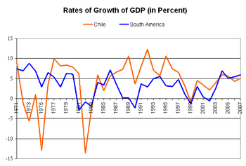 After the recession, Chilean economic growth rose quickly, eventually hovering between 5% and 10% and significantly outpacing the Latin American average (see chart). Additionally, unemployment decreased[101] and the percent of the population below the poverty line declined from 50 percent in 1984 to 34 percent by 1989.[102] This led Milton Friedman to call the period the "Miracle of Chile", and he attributed the successes to the neoliberal policies of the Chicago boys. Some scholars, however, attribute the successes to the re-regulation of the banking industry and a number of targeted social programs designed to alleviate poverty.[102] Others note that while the economy had stabilized and was growing by the late 1980s, inequality widened: nearly 45% of the population had fallen into poverty while the wealthiest 10% had seen their incomes rise by 83%.[103] According to Chilean economist Alejandro Foxley, by 1990 around 44% of Chilean families were living below the poverty line.[104]