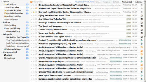 Feed aggregation applications are installed on a PC, smartphone or tablet computer and designed to collect news and interest feed subscriptions and group them together using a user-friendly interface. The graphical user interface of such applications often closely resembles that of popular e-mail clients, using a three-panel composition in which subscriptions are grouped in a frame on the left, and individual entries are browsed, selected, and read in frames on the right.