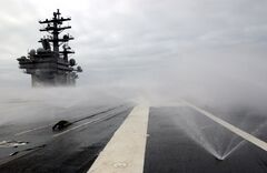 The flight deck is angled at nine degrees, which allows for aircraft to be launched and recovered simultaneously. This angle of the flight deck was reduced slightly compared to previous carriers, as the current design improves the airflow around the carrier.[13] Four steam catapults are used to launch fixed-wing aircraft, and four arrestor wires are used for recovery. The two newest carriers, Ronald Reagan and George H.W. Bush, have only three arrestor wires each, as the fourth was used infrequently on earlier ships and was therefore deemed unnecessary.[39]