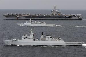 As a result of its target value and vulnerability, aircraft carriers are always escorted by at least one submarine for protection. The other vessels in the Strike Group provide additional capabilities, such as long-range Tomahawk missiles or the Aegis Combat System, and protect the carrier from attack. A typical Strike Group may include, in addition to an aircraft carrier: up to six surface combatants, including guided-missile cruisers and guided-missile destroyers, used primarily for anti-aircraft warfare and anti-submarine warfare, and frigates/guided-missile frigates, prior to their retirement from USN service. When the Navy commissions a new class of frigates (FFG(X)), they will again accompany CSGs. Also making up part of the group is one or two attack submarines for seeking out and destroying hostile surface ships and submarines and an ammunition, oiler, and supply ship from Military Sealift Command to provide logistical support.[40] The numbers and types of vessels that make up each strike group can vary from group to group, depending on deployments, mission, and availability.[41]
