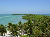 Mexico has a 9,330 kilometer coastline, of which 7,338 kilometers face the Pacific Ocean and the Gulf of California, and the remaining 2,805 kilometers front the Gulf of Mexico and the Caribbean Sea. Mexico's exclusive economic zone (EEZ) covers 3،269،386 km2 (1،262،317 sq mi) and is the 13th largest in the world. It extends 200 mi (320 km) nautical miles off each coast. The landmass of Mexico dramatically narrows as it moves in a southeasterly direction from the United States border and then abruptly curves northward before ending in the 500-kilometer-long Yucatán Peninsula. Indeed, the state capital of Yucatán, Mérida, is farther north than Mexico City or Guadalajara.