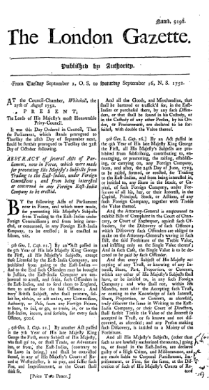 - ^ "The London Gazette | From Tuesday September 1 O.S. to Saturday September 16 N.S. 1752". London Gazette (9198): 1. 1 سبتمبر 1752.