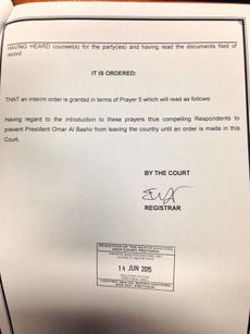 في 13 يونيو 2015، أصدرت المحكمة العليا في جنوب أفريقيا أمراً يمنع البشير من مغادرة جنوب أفريقيا مؤقتاً لحين النظر في القضايا المتهم فيها من طرف المحكمة الجنائية الدولية. ومنعت سلطات جنوب إفريقيا الرئيس السوداني من مغادرة جوهانسبرگ عقب انتهاء أعمال القمة الأفريقية. يذكر أن المحكمة الجنائية الدولية قد دعت في وقت سابق سلطات جنوب إفريقيا إلى اعتقال البشير أثناء زيارته لحضور قمة الاتحاد الإفريقي التي تجري في جوهانسبرگ. وطالب رئيس المحكمة الجنائية الدولية جنوب أفريقيا، باتخاذ كل الجهود لضمان تنفيذ مذكرة التوقيف الصادرة بحق البشير الذي تلاحقه المحكمة منذ 2009 بتهمة ارتكاب جرائم حرب وجرائم ضد الإنسانية. أعقب إعلان هذا الحكم تصريح من الحكومة السودانية بأن البشير يستكمل زيارته بشكل طبيعي وأنه سيعود للسودان بعد انتهاء القمة الأفريقية.[28]