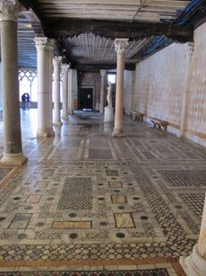 It spread to Rome in the first decades of the 1st c. BC when "stone slab floors came into use, at least in the smaller element type".[3] Under Augustus, its use in the flooring of public buildings began. The success of the first experiments on a monumental scale led to its application in the private sector, where decorative schemes with smaller marble sections were perfected, but which were very expensive due to the more complex execution. Hence these first examples are limited to imperial properties, such as the villa of Livia at Prima Porta and those of Tiberius on Capri.[4]
