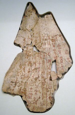 1. ^ A tiny number of isolated mid to late Shang pottery, bone and bronze inscriptions may predate the oracle bones. However, the oracle bones are considered the earliest significant body of writing, due to the length of the inscriptions, the vast amount of vocabulary (very roughly 4000 graphs), and the sheer quantity of pieces found – at least 100,000 pieces[3][4] bearing millions of characters,[5] and around 5,000 different characters,[5] forming a full working vocabulary (Qiu 2000, p. 50 cites various statistical studies before concluding that "the number of Chinese characters in general use is around five to six thousand"). There are also inscribed or brush-written Neolithic signs in China, but they do not generally occur in strings of signs resembling writing; rather, they generally occur singly and whether or not these constitute writing or are ancestral to the Shang writing system is currently a matter of great academic controversy. They are also insignificant in number compared to the massive amounts of oracle bones found so far.[6][7][8]