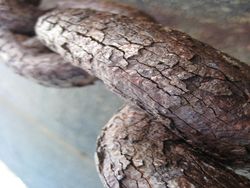 A uranium mine, near Moab, Utah. Note alternating red and white/green sandstone. This corresponds to oxidized and reduced conditions in groundwater redox chemistry. The rock forms in oxidizing conditions, and is then "bleached" to the white/green state when a reducing fluid passes through the rock. The reduced fluid can also carry uranium-bearing minerals.