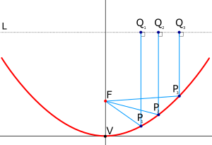 If a parabola is positioned in Cartesian coordinates with its vertex at the origin and its axis of symmetry along the y-axis, so the parabola opens upward, its equation is , where is its focal length. (See "Parabola#In a cartesian coordinate system".) Correspondingly, the dimensions of a symmetrical paraboloidal dish are related by the equation: where is the focal length, is the depth of the dish (measured along the axis of symmetry from the vertex to the plane of the rim), and is the radius of the dish from the center. All units used for the radius, focal point and depth must be the same. If two of these three quantities are known, this equation can be used to calculate the third.