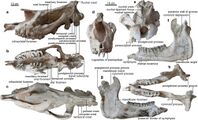 According to Lucas and Sobus, the type species P. bugtiense from the late Oligocene of Pakistan included junior synonyms such as B. osborni and P. zhajremensis. P. transouralicum from the late Oligocene of Kazakhstan, Mongolia, and northern China included B. grangeri and I. minus. By this scheme, P. orgosensis from the middle and late Oligocene of northwest China included D. turfanensis and P. lipidus.[22] In 2013, the American palaeontologist Donald Prothero suggested that P. orgosensis may be distinct enough to warrant its original genus name Dzungariotherium, though its exact position requires evaluation. P. prohorovi from the late Oligocene of Kazakhstan may be too incomplete for its position to be resolved in relation to the other species; the same applies to proposed species such as I. intermedium and P. tienshanensis, as well as the Georgian genus Benaratherium.[3][22] Though the genus name Indricotherium is now a junior synonym of Paraceratherium, the subfamily name Indricotheriinae is still in use because genus name synonymy does not affect the names of higher level taxa that are derived from these. Members of the subfamily are therefore still commonly referred to as indricotheres.[24]