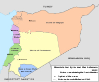 أصبحت سوريا ولبنان محمية فرنسية (كان تحت اسم انتداب عصبة الأمم).[7] قوبلت السيطرة الفرنسية على الفور بمقاومة مسلحة، ومن أجل مكافحة القومية العربية، قسمت فرنسا انتدابها على لبنان وأربع دول فرعية أخرى.[8]