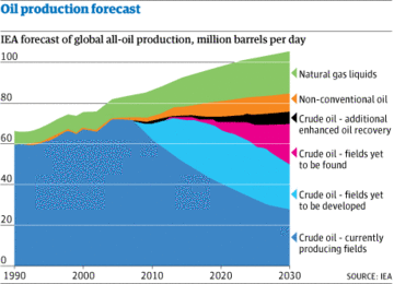 وأشارت الصحيفة إلى تساؤل معين بشأن توقعات ظهرت في آخر تقرير لوكالة الطاقة بأن الإنتاج العالمي من النفط يمكن زيادته من 83 مليون برميل يوميا إلى 105 ملايين برميل.