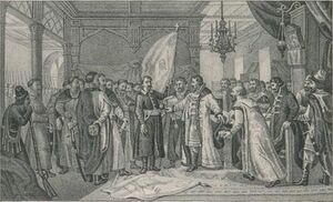 - يناير 1649 – في موسكو، أقنع البطريرك بايسيوس نوايا القيصر خملنيتسكي "... بجبين جلالتك الإمبراطورية، لذلك أمر الإمبراطور بمنحه، وخملنيتسكي وكل مضيف زاپوريژيا تحت حكمه الإمبراطورية العالية ..."،[12]ولكن ذُكر في مذكرات موزيلوڤسكي طلب المساعدة العسكرية فقط، في حين أن مسألة الولاء للقيصر لم تُثر.[12]