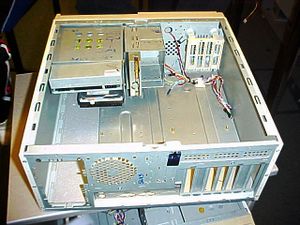 A stripped ATX case lying on its side.