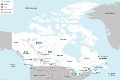 خريطة كندا موضح عليها آبار النفط وخطوط الأنابيب.